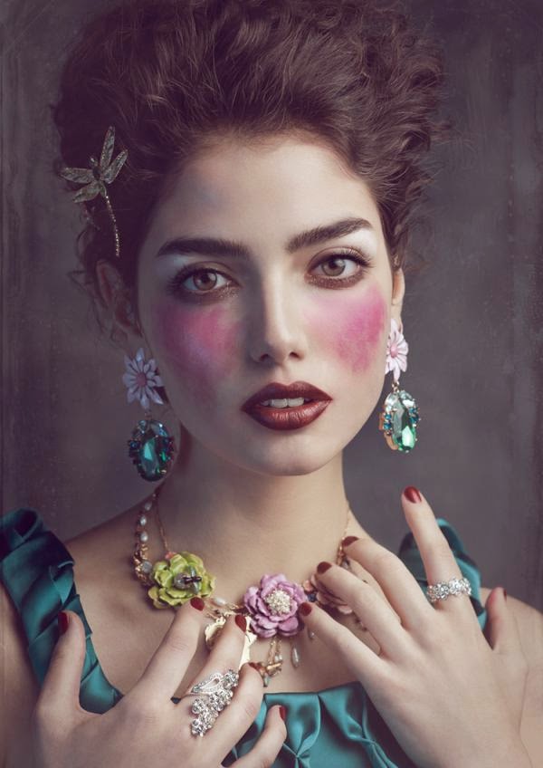 Virginia looked really stunning and beautiful with sultry look and seems demure in her poses. In these pictures you will find this hazel eyed beauty Virginia with close-up shots. Her makeup is ethereal and there are a lot of hues off pink and orange on her cheeks. She steals the limelight with hazy smoky eyes and thick eyebrows and flowers galore. I really loved her sculptural rings, tiara-like headbands and ornate earrings.